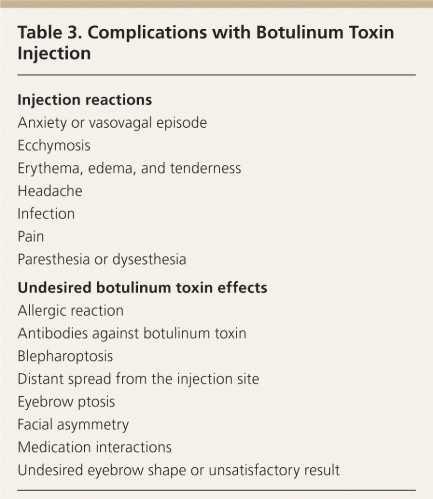 Complications with cosmetic botulinum toxin injections are uncommon and those that occur are usually mild and transient. They can be categorized into injection reactions and undesired botulinum toxin effects.