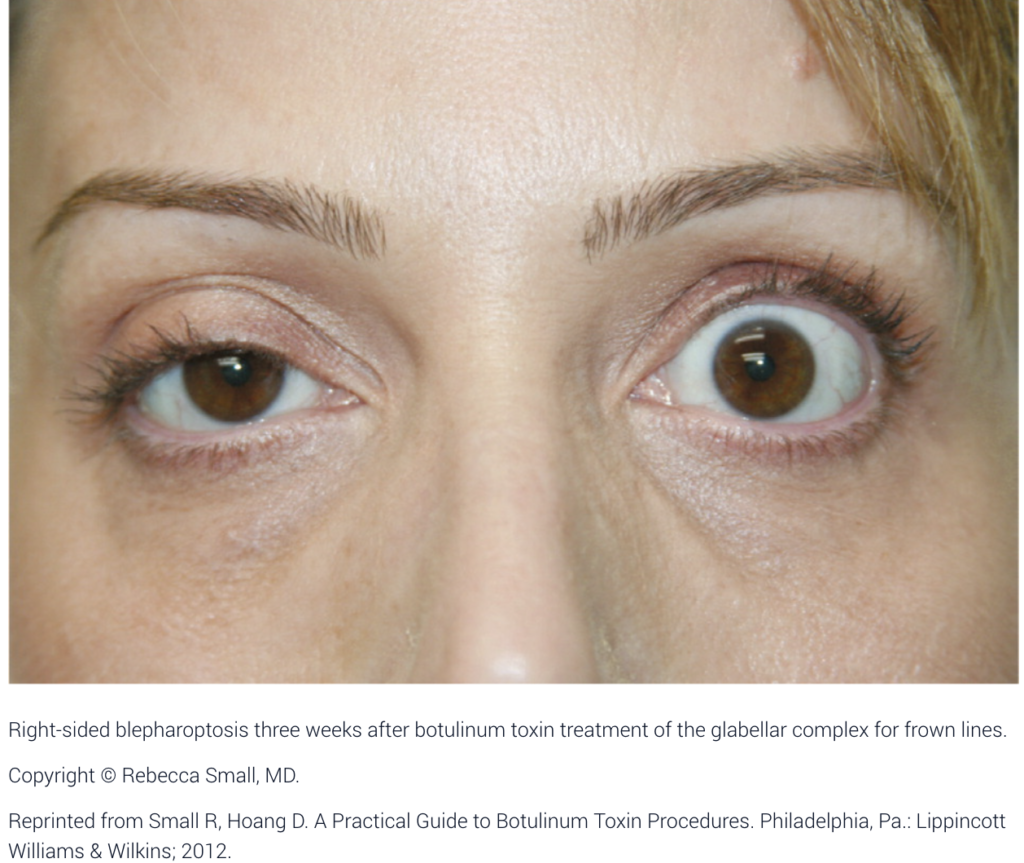 Complications related to botulinum toxin effects occur less frequently than injection reactions, and are primarily caused by temporary denervation of adjacent muscles outside of the intended treatment area. These complications are technique-dependent; incidence declines as injector skill improves. Temporary blepharoptosis (upper eyelid droop) is uncommon (1% to 5%) but is distressing for patients. It is almost always unilateral, seen as a 2- to 3-mm lowering of the affected eyelid that is most marked at the end of the day with muscle fatigue.