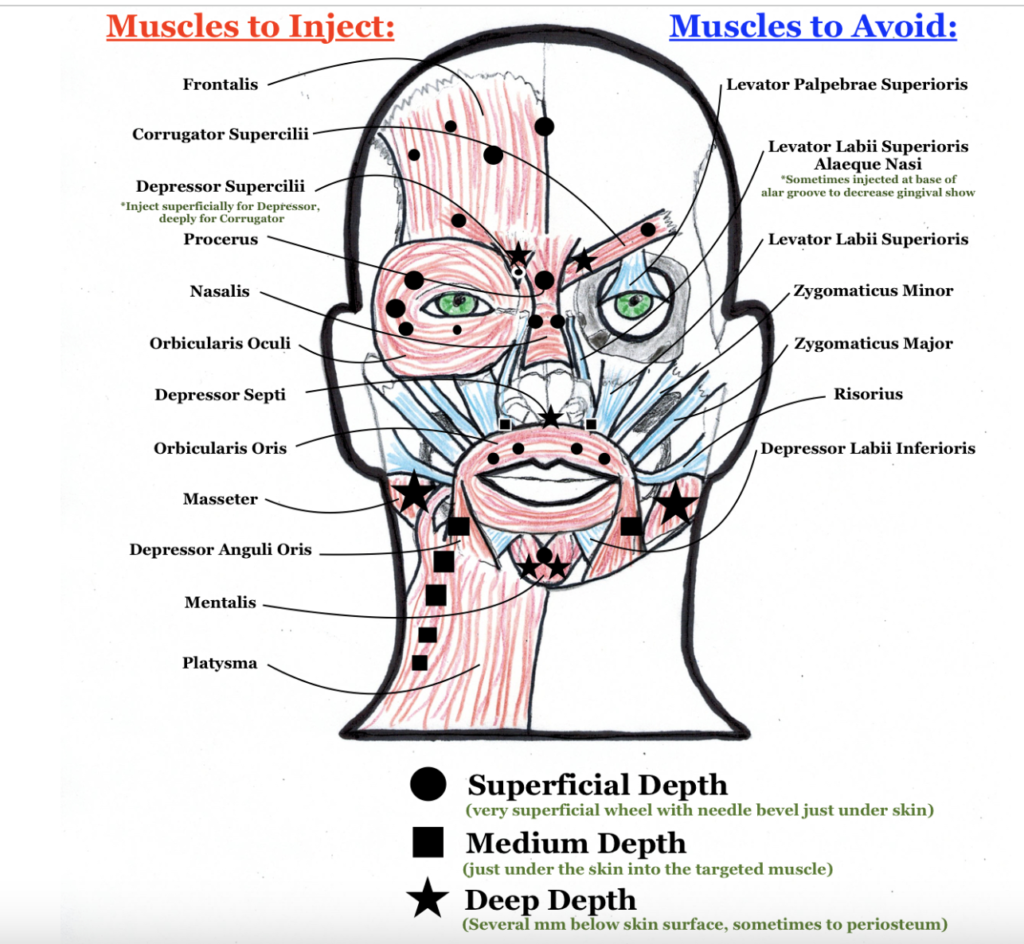 Guidelines for injecting neurotoxins and fillers involve a deep understanding of facial anatomy to ensure effective and safe outcomes. Here are key points on which muscles to inject and which to avoid: