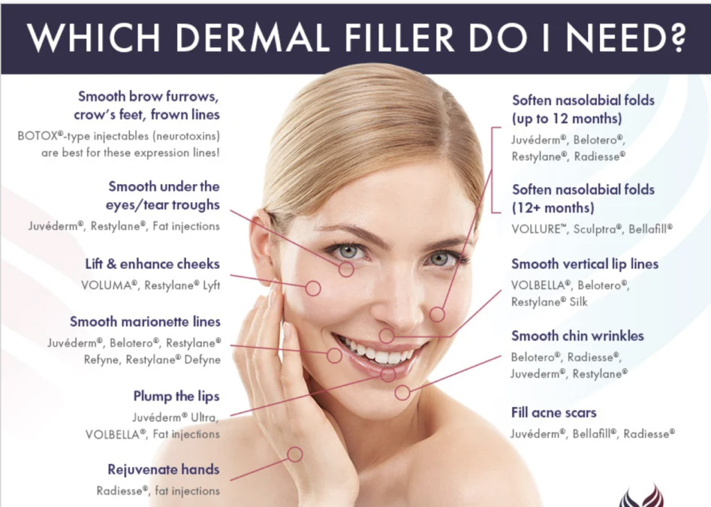 Each filler is designed to have a different texture, density, and injection depth. Certain fillers work better for certain areas than others. Your provider will determine which filler is best for you. Dermatologists use softer fillers in the lips and sturdier products for cheekbone enhancement.